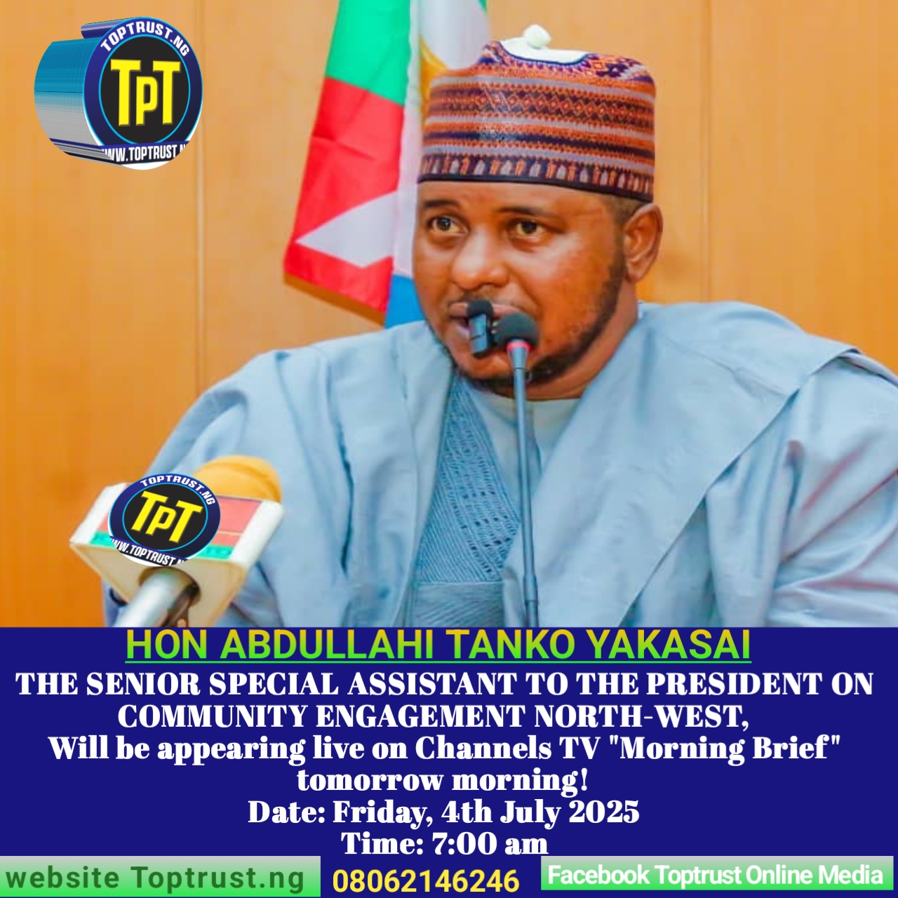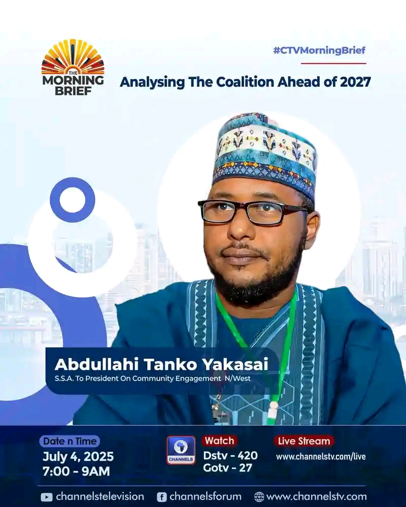 We are excited to announce that Honourable Abdullahi Tanko Yakasai, the Senior Special Assistant to President Tinubu on Community Engagement (North-West), will be appearing live on Channels TV “Morning Brief” tomorrow morning! Date: Friday, 4th July Time: 7:00 am Topic: “The Edge APC Government has towards the 2027 Elections”