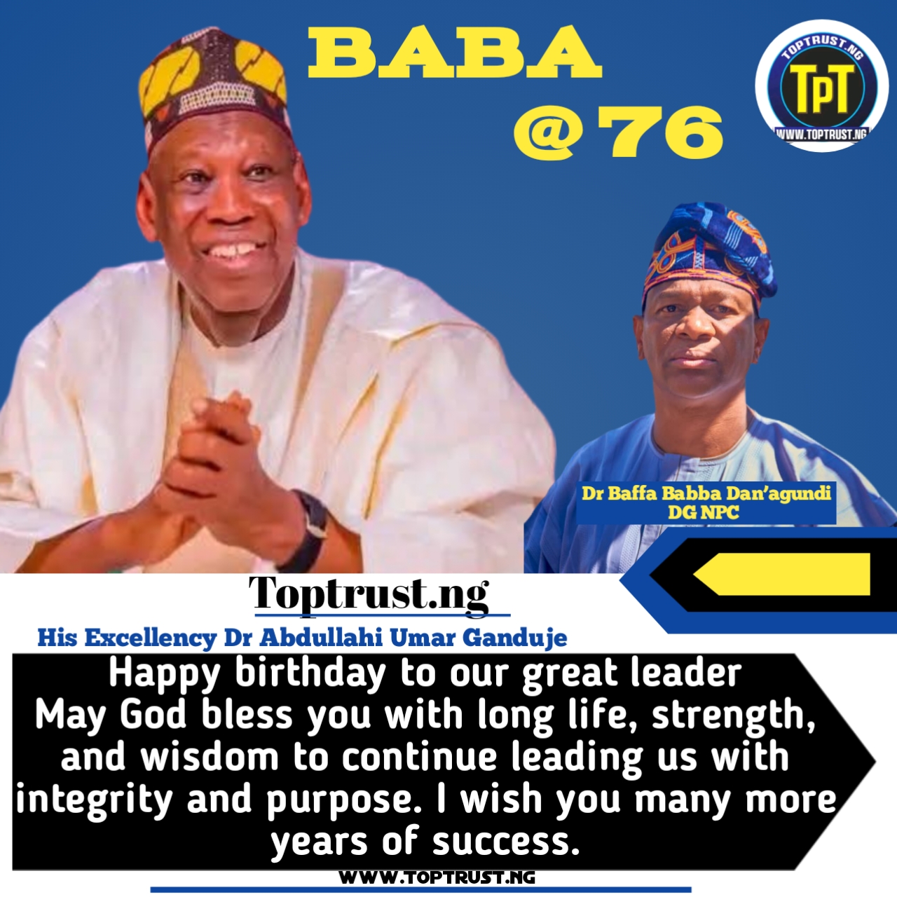 The Director General of the National Productivity Centre (NPC), Dr. Baffa Babba Danagundi,nim, has warmly congratulated His Excellency, Dr. Abdullahi Umar Ganduje,(con) (Khadimul Islam), on the occasion of his 76th birthday, describing him as a towering political figure and a steadfast pillar of democracy in Nigeria.